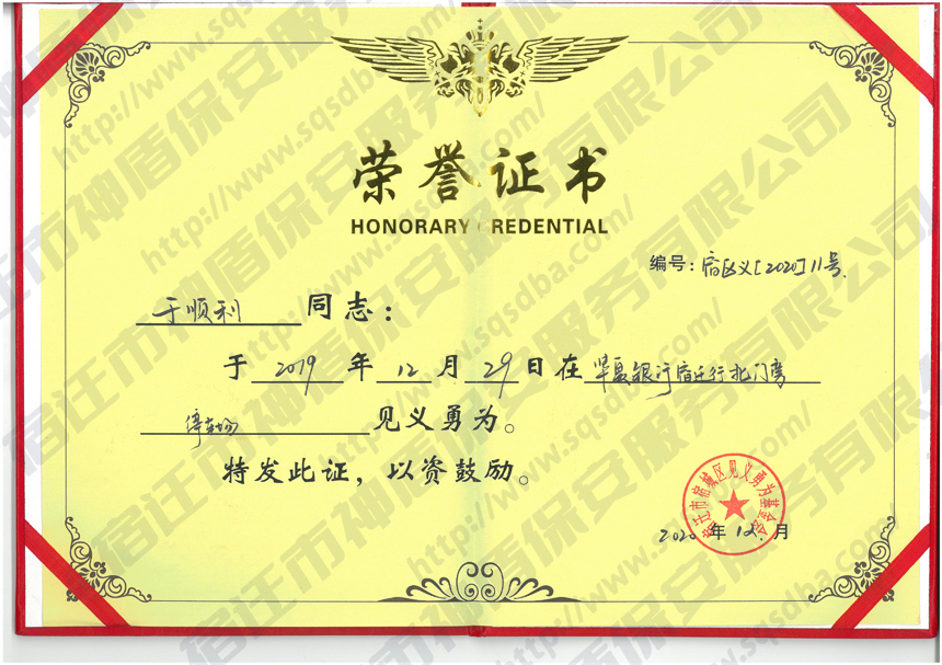 保安員見義勇為獲獎證書
